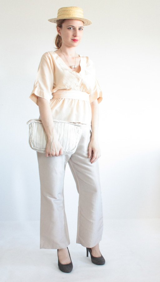 Jedwabna, kremowa bluzka o pięknym fasonie. W talii wszyte gumki. Dodatkowo można podkreślić taliępaskiem, który nie jest przyszyty do bluzki (bluzka posiada bardzo cieniutkie, delikatne szlufki, można więc nosić ją z paskiem lub bez).