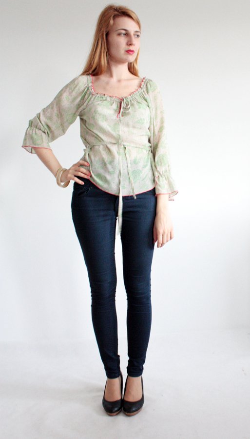 Zwiewna, delikatna bluzka ze 100%-owego jedwabiu w subtelne wzory w odcieniach pastelowej zieleni. Przy dekolcie delikatnie polyskujące kryształki widoczne na zdjęciach. Dekolt regulowany troczkiem.