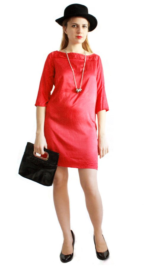 Przepiękna, prosta sukienka skandynawskiej marki By Groth w głębokim odcieniu czerwieni. Uszyta z lekko elastycznego jedwabiu.