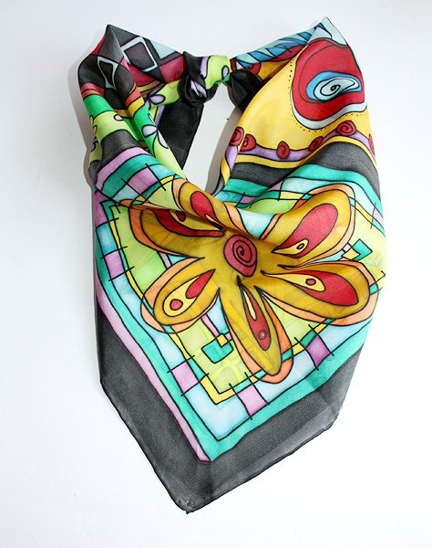 Chusta w efektowne, malowane wzory wykonana z naturalnego jedwabiu. Będzie ciekawym uzupełnieniem stonowanego stroju i ożywi go.