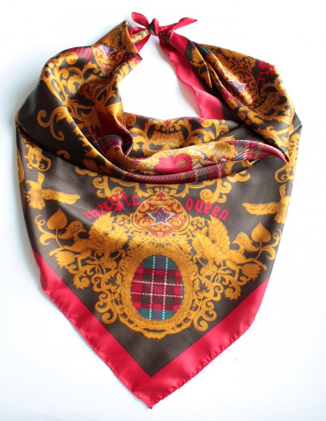 Piękna, efektowna chusta we wzory w stylu domu mody HERMES. Materiał to prawdopodobnie jedwab naturalny lub syntetyczny.