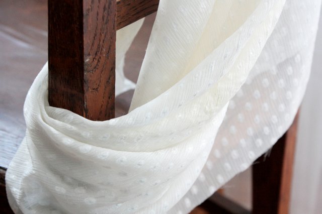 Jedwabna chusta o transparentnej fakturze wytłaczanej w groszki w tym samym kolorze.