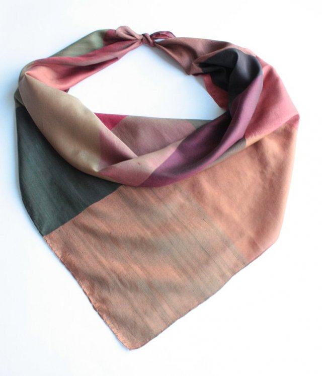 Duża chusta w wielobarwną kratę wykonana prawdopodobnie z jedwabiu. Chustę można układać na wiele sposobów uzyskując różnorodne efekty kolorystyczne.