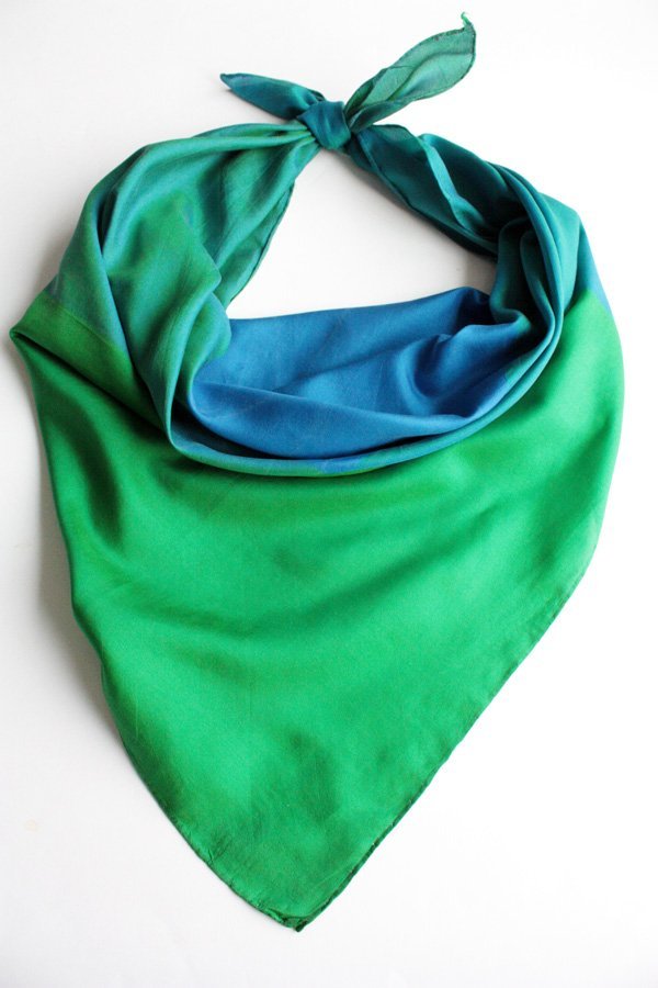 Piękna chusta wykonana prawdopodobnie z jedwabiu, podzielona na cztery strefy kolorystyczne w odcieniach niebieskiego i zielonego. Dzięki temu szal można układać na wiele sposobów i uzyskiwać różne efekty. Miejscami skazy na materiale (widoczne na zdjęciu).