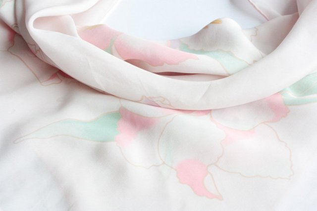 Niezwykle subtelna chusta w pastelowych tonach wykonana z miękkiego, delikatnego w dotyku, szlachetnego materiału. Moim zdaniem jest to jedwab naturalny.