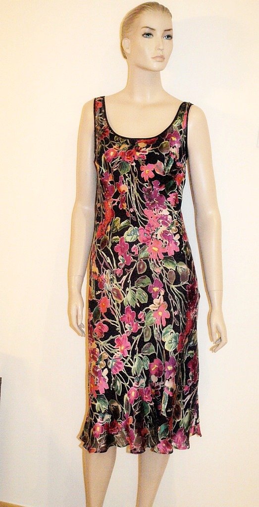 śliczna sukienka od projektantki, materiał 55% jedwab 45% wiskoza. Sukienka z transparentnego materiału na którym są jakby naklejone kwiaty. Pod spodem podszewka na cienkich ramiączkach. Materiał cięty ze skosu, Wkładana przez głowę. Stan bardzo dobry. Rozmiar z metki 10, powinna pasować na 36. Podaję wymiary mierzone na płasko;