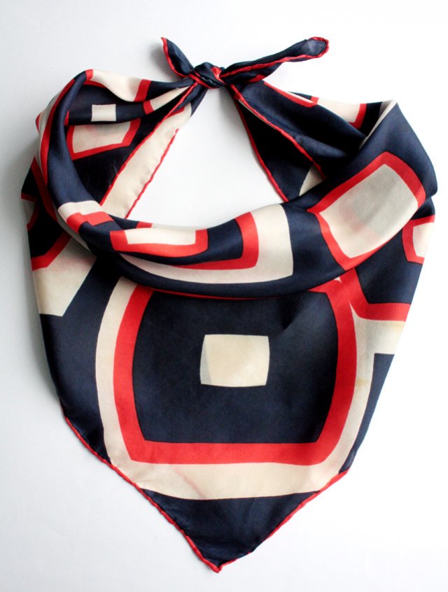 Chusta w oryginalne geometryczne wzory w stylu retro. Materiał oceniam na jedwab naturalny lub syntetyczny. Kolory: biel, czerwień, granat.