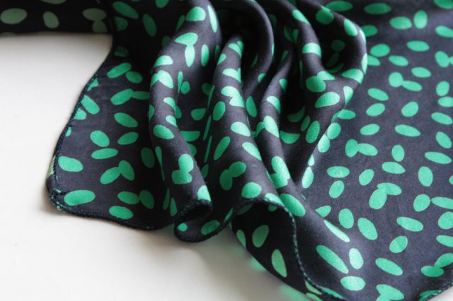 Granatowa chusta w zielone wzory wykonana prawdopodobnie z jedwabiu.