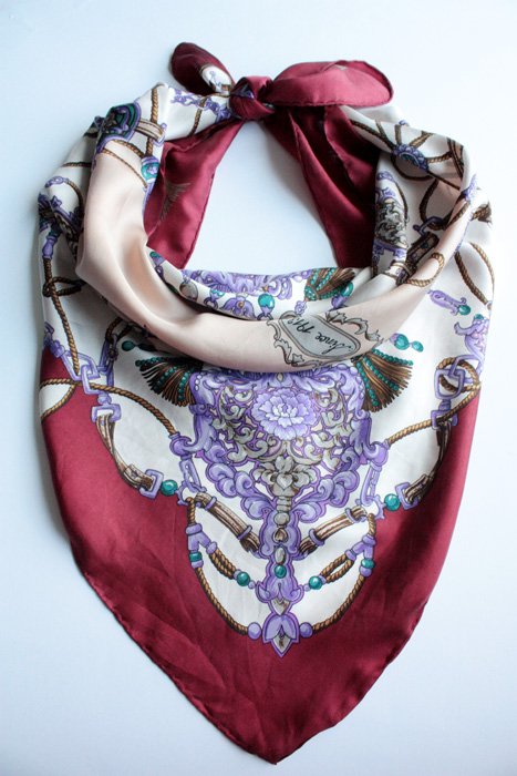 Przepiękna chusta w królewskie wzory w stylu HERMESa. Materiał oceniam na jedwab. Wyjątkowa chusta z tej serii o nietypowej kolorystce, obwódka w głębokim odcieniu czerwibegi wina, wzory w kolorze zdecydowanego fioletu. Brzegi są rolowane.
