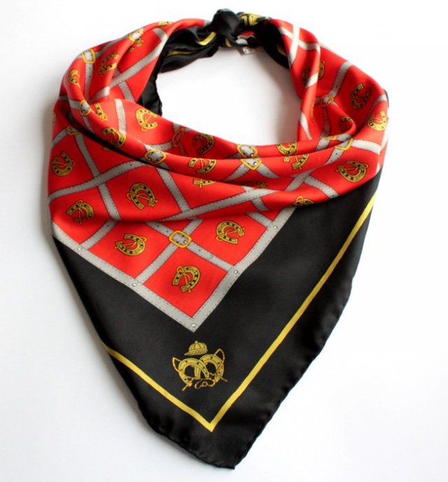 Chusta we wzory charakterystyczne dla domu mody HERMES. Wykonana z naturalnego jedwabiu.