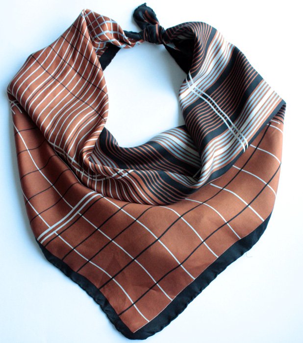 Subtelna chusta sygnowana Jean Parel. Wykonana prawdopodobnie z jedwbaiu, brzegi są rolowane. Chustę można układać na różne sposoby, uzyskująć różne efekty kolorystyczne.