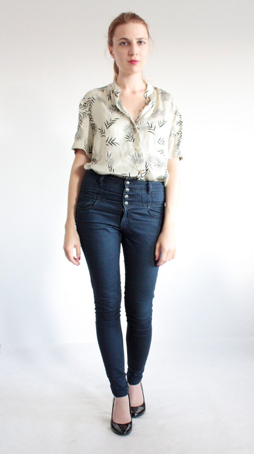 Jedwabna zapinana bluzka w subtelne roślinne motywy na tle bardzo jasnej, rozcieńczonej limonki z delikatną nutą żółtego.