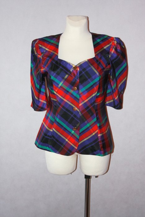niezwykle oryginalna kolorowa kraciasta bluzka vintage zapinana na guziki w kolorze starego złota, w ramionach poduszki, dłuższy rękawek z marszczeniami, sztywniejszy, śliski materiał z lekkim połyskiem