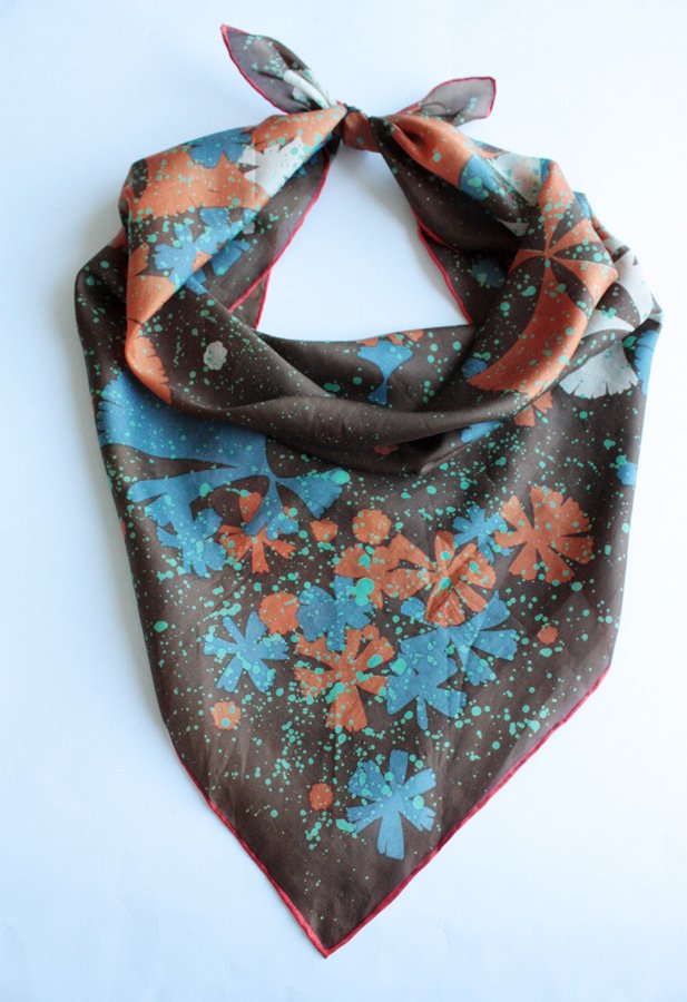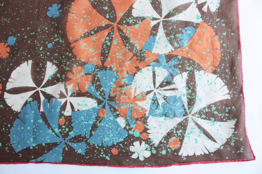 Zwiewna chusta w kwiatowe, nietypowe wzory. Wykonana prawdopodobnie z jedwabiu.