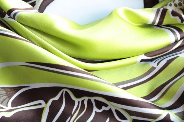 Limonkowa chusta w kwiatowe wzory. Materiał oceniam na jedwab.