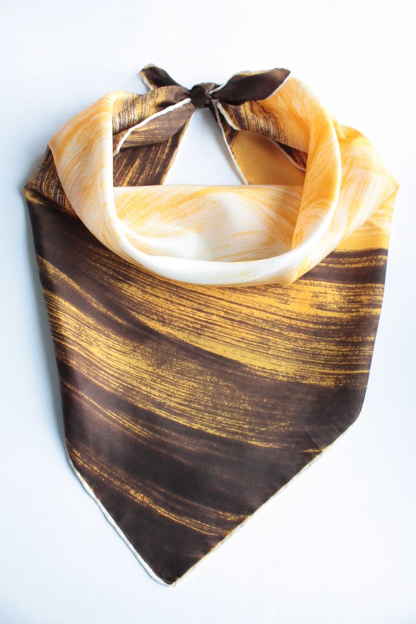 Oryginalna chusta we wzory przypominające pociągnięcia pędzlem malarza. Materiał to prawdopodobnie jedwab naturalny lub syntetyczny.