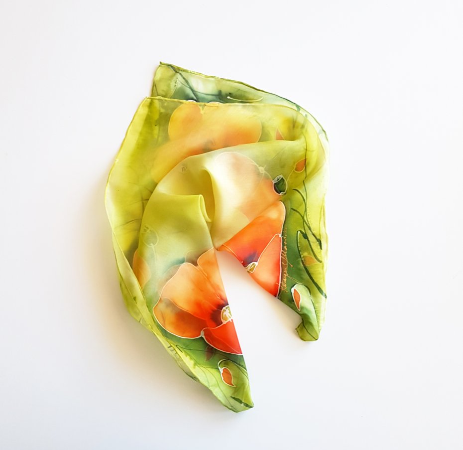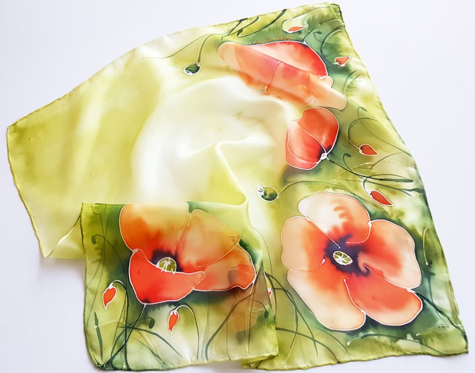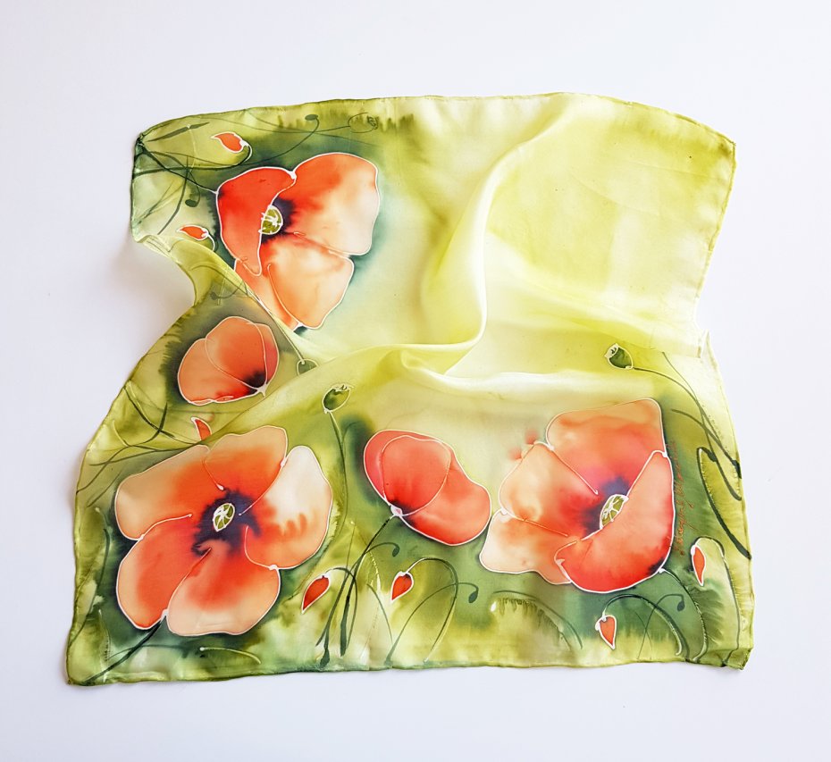 Delikatna, ręcznie malowana, jedwabna apaszka o wzorze maków na cieniowanym tle. Maki w odcieniach pomarańczu i czerwieni z podkreślonym transparentną guttą rysunkiem. Tło to odcienie złamanej cieniowanej zieleni. Apaszka podpisana przez autorkę. Wymiary apaszki to 55 x 55cm.