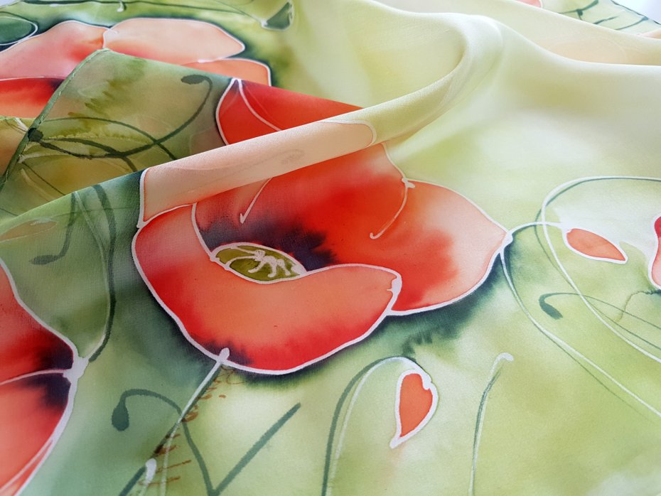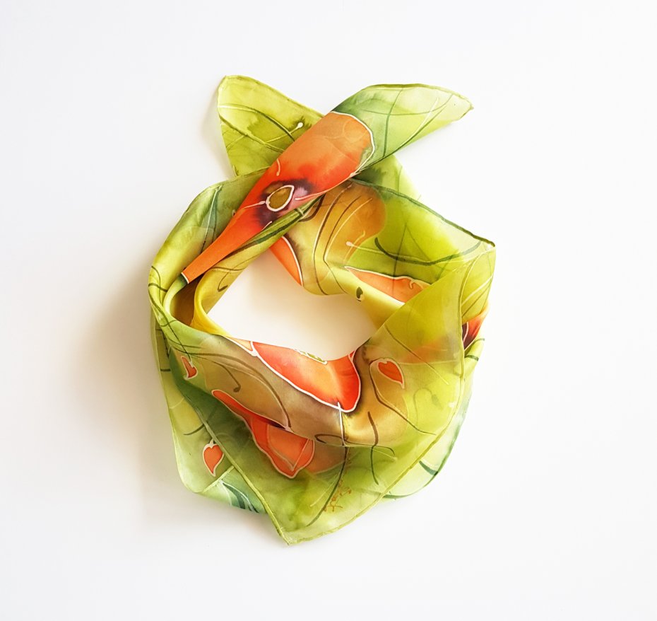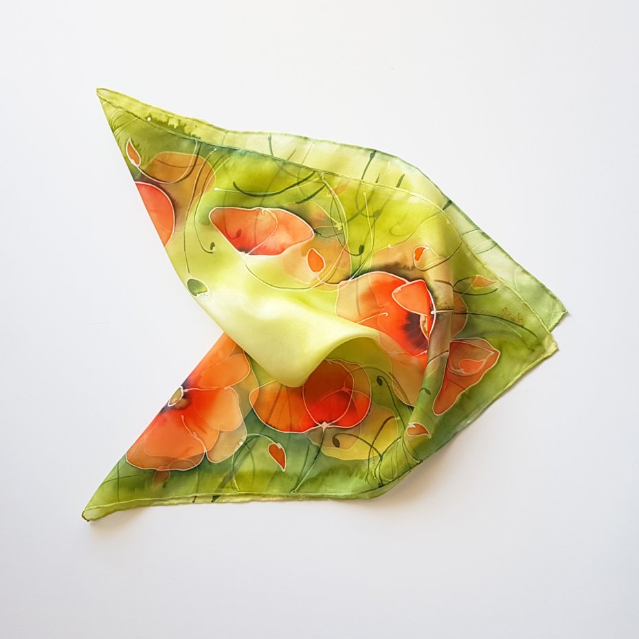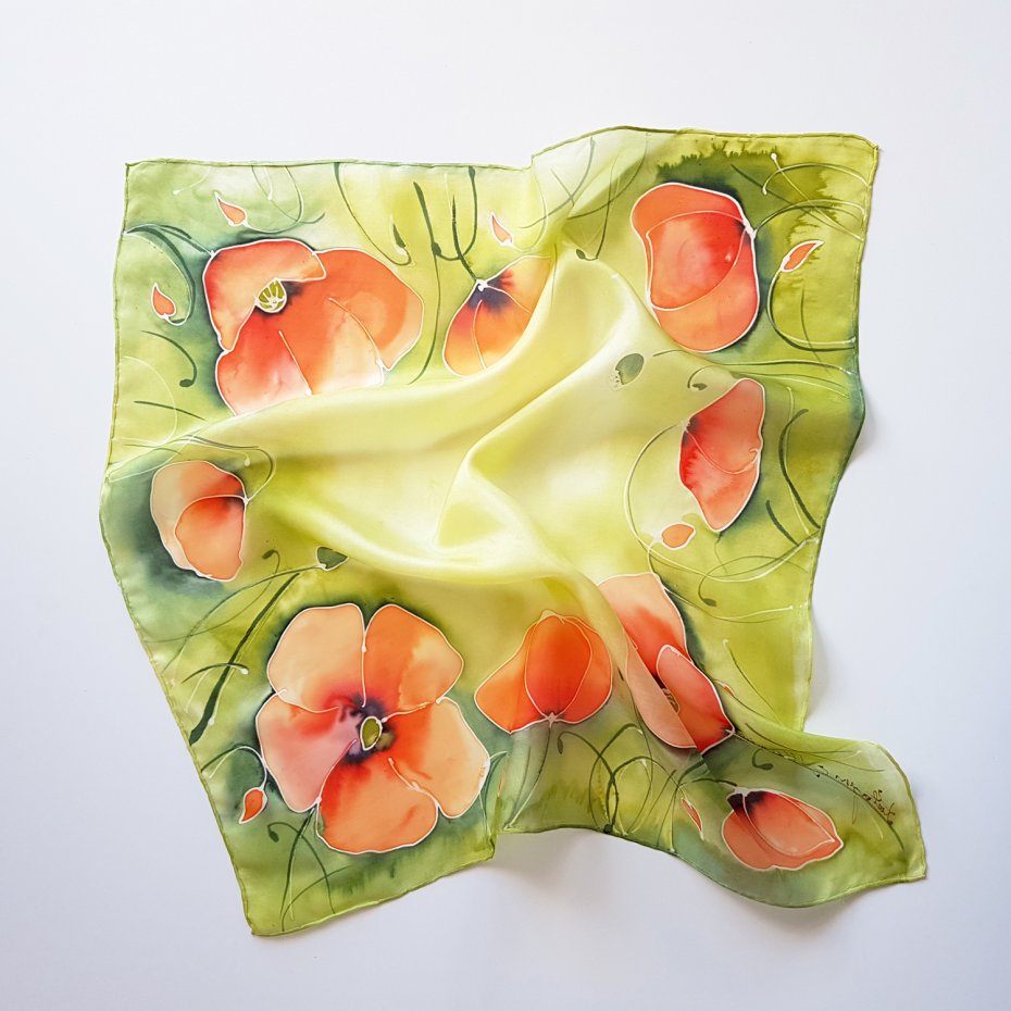 Delikatna, ręcznie malowana, jedwabna apaszka o wzorze maków na cieniowanym tle. Maki w odcieniach pomarańczu i czerwieni z podkreślonym transparentną guttą rysunkiem. Tło to odcienie złamanej cieniowanej zieleni. Apaszka podpisana przez autorkę. Wymiary apaszki to 55 x 55cm.