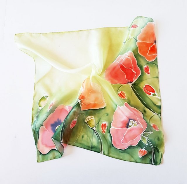 Delikatna, ręcznie malowana, jedwabna apaszka o wzorze maków na cieniowanym tle. Maki w delikatnych odcieniach czerwieni, pomarańczu oraz różu z podkreślonym transparentną guttą rysunkiem. Tło to odcienie cieniowanego rozbielonej zieleni. Apaszka podpisana przez autorkę. Wymiary apaszki to 55 x 55cm.