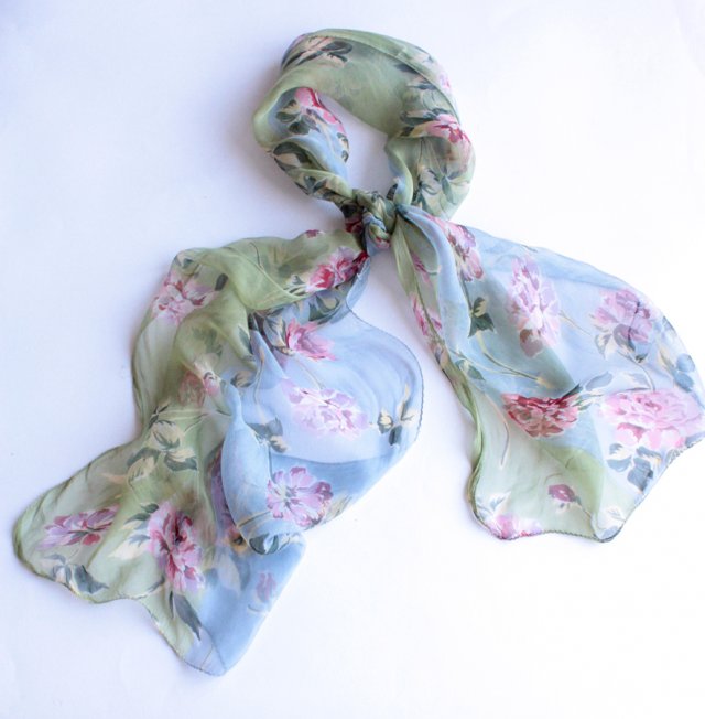 Subtelny szal typu mgiełka w różane wzory na niebieskim i zielonym tle. Materiał to prawdopodobnie jedwab naturalny lub syntetyczny.