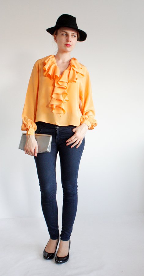 Niezwykła bluzka w morelowym kolorze. Materiał to prawdopodobnie jedwab naturalny.