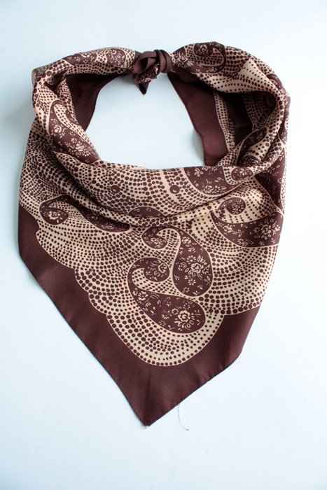Oryginalna chusta w stylu retro w odcieniu ciepłego brązu i ercu. Materiał oceniam na jedwab syntetyczny.