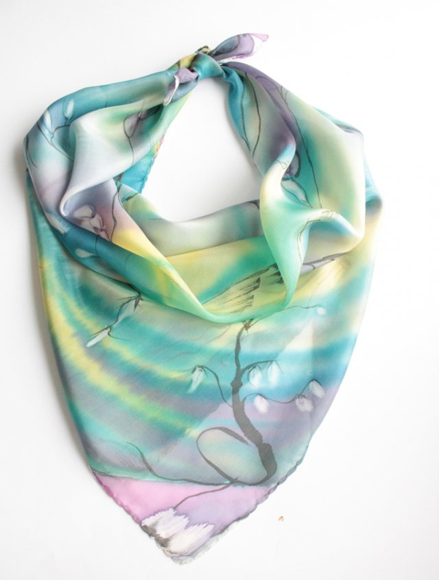 Zwiewna, duża chusta w niebanalne wzory. Materiał oceniam na jedwab naturalny.