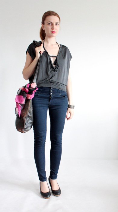 Bluzka marki GOSHA o niezwykłym fasonie. Materiał jest elastyczny, w mojej ocenie jest to prawdopodobnie jedwab z domieszką syntetyku.