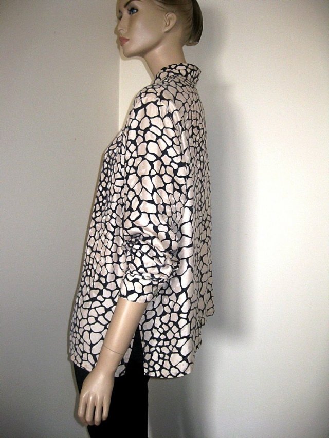 piękna, jedwabna koszula od projektanta. materiał w zwierzęcy wzór dodatkowo tłoczony w drobne listki. kolor jasny beż łączony z szarym. jedwab bez poślizgu , taki matowy w dotyku. Stan materiału bardzo dobry. niezłapany brzeg jednej dolnej dziurki (niewidoczne). Rozmiar z metki 48, ale myślę, ten fason powinien pasować na 40-46. na manekinie o rozmiarze 38.