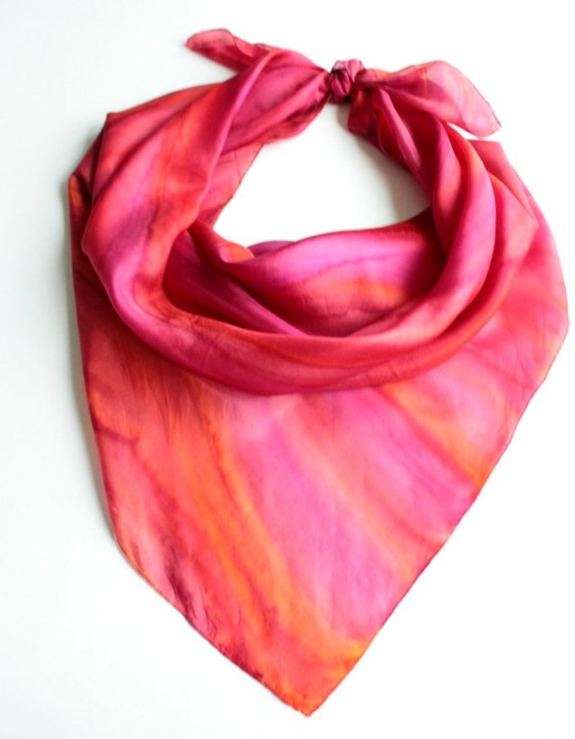 Duża chusta w przelewanych odcieniach czerwieni i różu, wykonana w mojej ocenie z jedwabiu.
