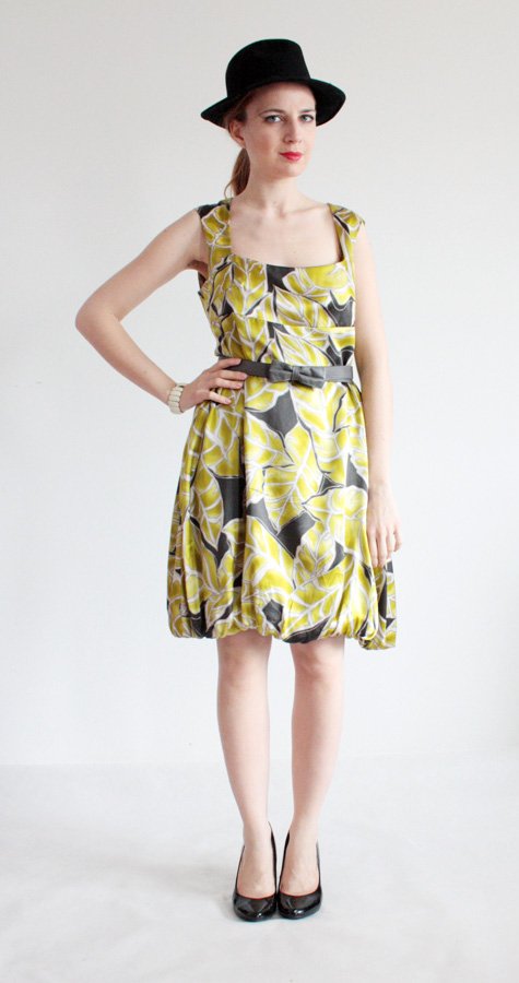 Oryginalna sukienka w roślinne motywy w limonkowym odcieniu. Posiada podszewkę. Materiał oceniam na elegancki jedwab. Na dole fason typu lekka bombka.