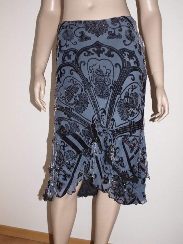 Letnia jedwabna spódnica marki tara. delikatny transparentny cięty ze skosu jedwab (60%) z welurowym wzorem (sztuczny jedwab 40%), dodatkowo ozdobiona delikatnymi koralikami. zamek z boku, pod spodem jedwabna 100% podszewka, Rozmiar z metki 40, ale chyba większa. na manekinie o rozmiarze małe 38. Podaję wymiary mierzone na płasko;