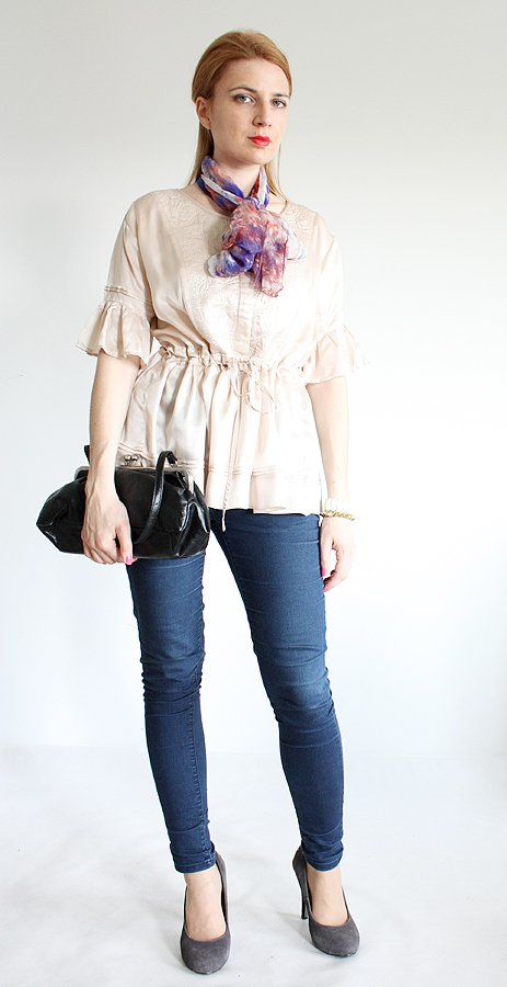 Jasnobeżowa, efektowna bluzka uszyta z jedwabiu. Z przodu kryte zapięcie w postaci zatrzasków do połowy długości. W talii ściąganie troczkiem. Z przodu subtelny haft w tym samym odcieniu.