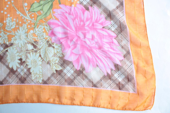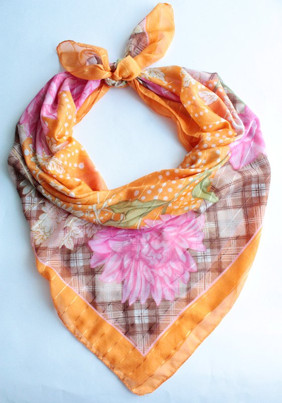 Półtransparentna, piękna chusta w kwiatowe wzory. Materiał jest miękki, miły w dotyku. Jest to być może jedwab naturalny lub syntetyczny (brak metki).