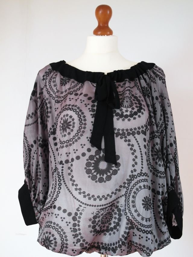 Szeroko wszyte rękawy oraz gumka w wykończeniu dołu - dają możliwość różnym rozmiarom. Stan idealny, 100% jedwab.