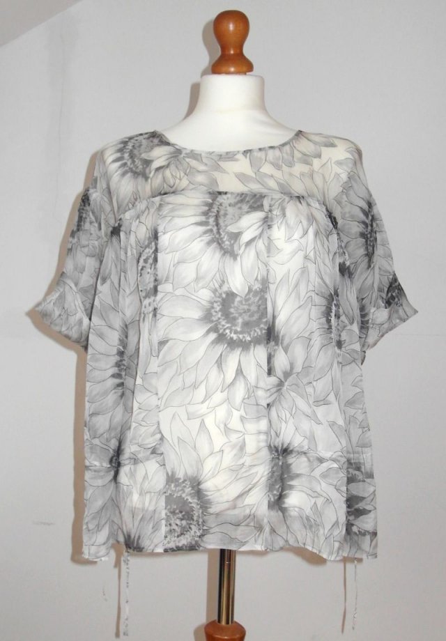 Przez swój krój oraz ściągane troczki po bokach pozwala na pewną rozpiętość rozmiarową. Kolor - pastelowe odcienie szarości. Stan idealny.