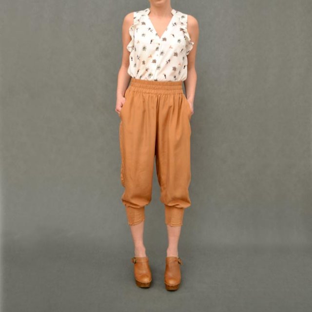 Jedwabne spodenki typu pumpy w camelowym kolorze. Pas i nogawki na gumkach, z boku kieszonki.
