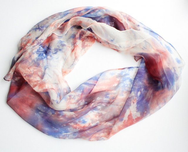 Jeśli cenisz niezwykłą estetykę i wysoką jakość, zakochasz się w tym szalu od pierwszego wejrzenia. Tkanina żyje w ruchu, faluje, wzory zmieniają się, przypominając abstrakcyjny obraz. Materiał jest zwiewny, półtransparentny, matowy (w mojej ocenie jest to jedwab). Szal będzie bardzo kobiecym, subtelnym dodatkiem przykuwającym uwagę.