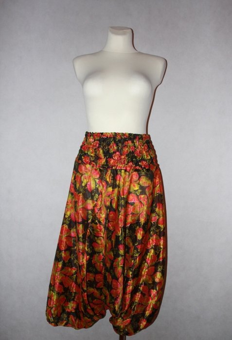 rewelacyjne jedwabne szarawary w kwiaty, szeroki pas z gumką, nogawki również zakończone gumką, prześwitujące