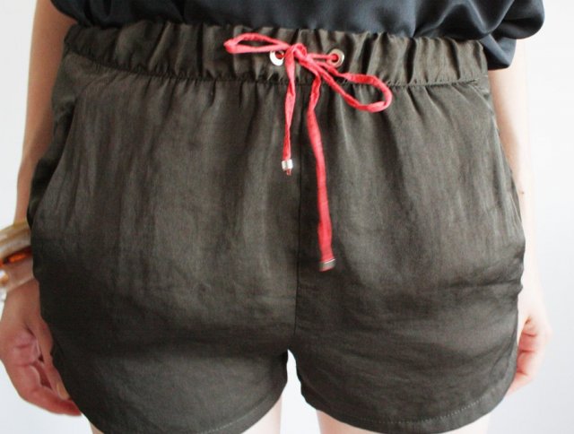 Szorty marki Zara z linii Basic. Podszewka kieszeni w neonowym kolorze. Materiał to prawdopodobnie jedwab (brak metki ze składem). W talii wszyta guma. Wymiary podane przed i po rozciągnięciu.