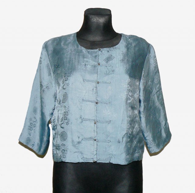 Bluzka narzutka luksusowej marki Tan Giudicelli. W gołębim niebieskim kolorze. Delikatny wzór na całej tkaninie. Zapinana na metalowe kuleczki, rękaw 3/4.