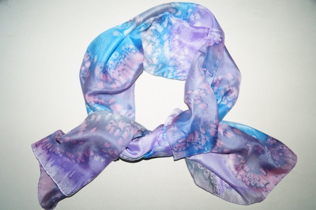 Delikatny i zwiewny jedwabny szal w pięknych twarzowych kolorach: fiolet, błękit, róż, szary, ręcznie farbowany w abstrakcyjny wzór, brzeg ręcznie rolowany,