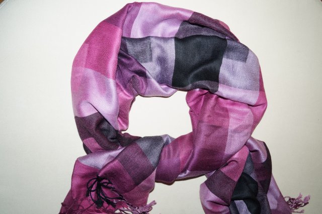 Piękny jedwabny szal z motywem geometrycznym w twarzowych odcieniach różu i czerni, miły, delikatny, mięsisty, ładnie się układa, z delikatnym połyskiem