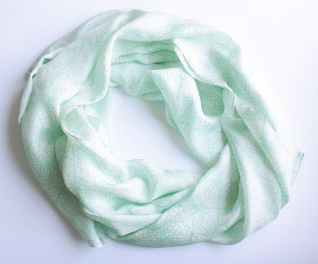 Delikatny, niezwykle elegancki, duży szal marki NOA NOA w subtelne motywy w odcieniu stonowanej morskiej zieleni. Materiał oceniam na jedwab.