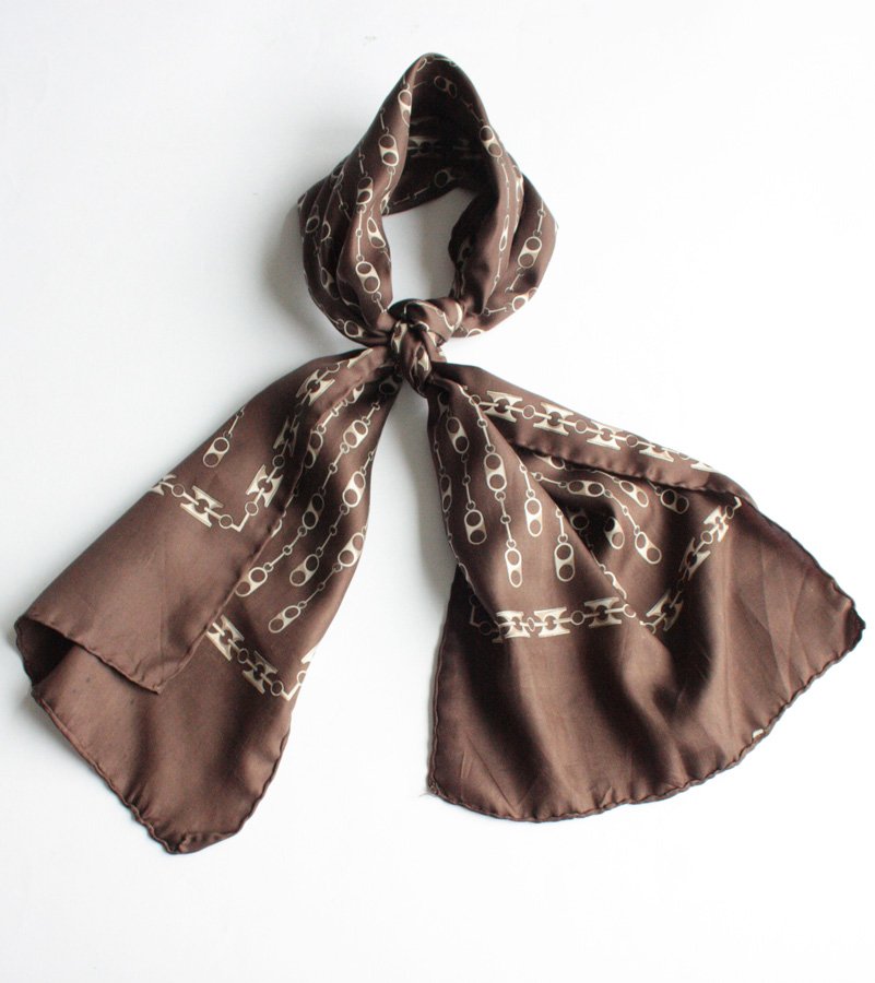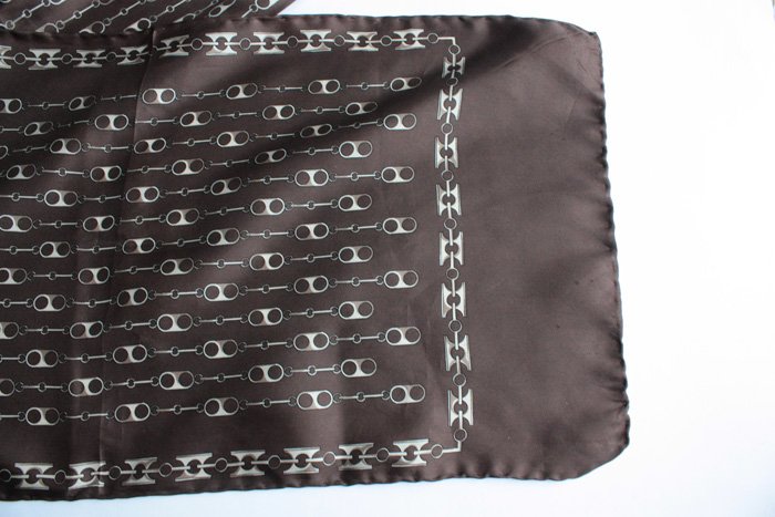 Elegancki szal w kolorze brązowym, w subtelne wzory. Materiał to w mojej ocenie jedwab, brzegi są ręcznie rolowane.