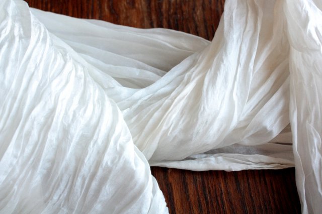 Duży, biały szal o efektownej gniecionej fakturze. Wykonany w 100% z jedwabiu.