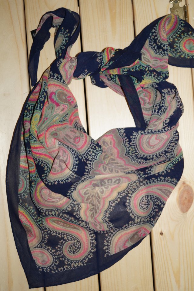 Ciekawa jedwabna chusta marki JAEGER w kształcie trójkąta, na granatowym tle wzór paisley w ładnych tęczowych kolorach, nieco cieniowana, delikatny materiał, ładnie się układa o strukturze jakby trochę karbowanej, półprzezroczysty