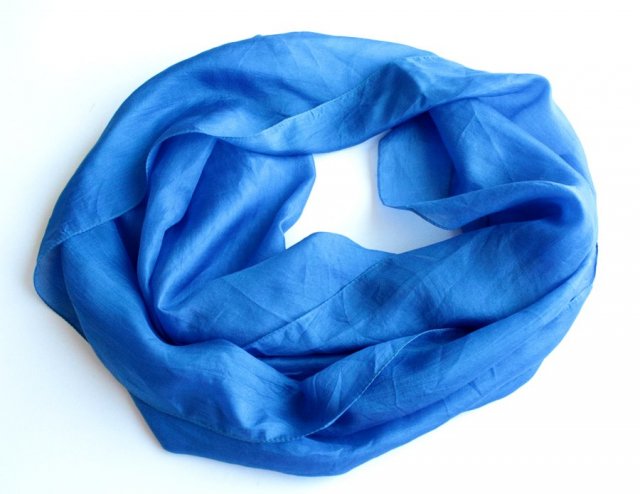 Zwiewny szal w głębokim kobaltowym odcieniu, wykonany w mojej ocenie z jedwabiu.