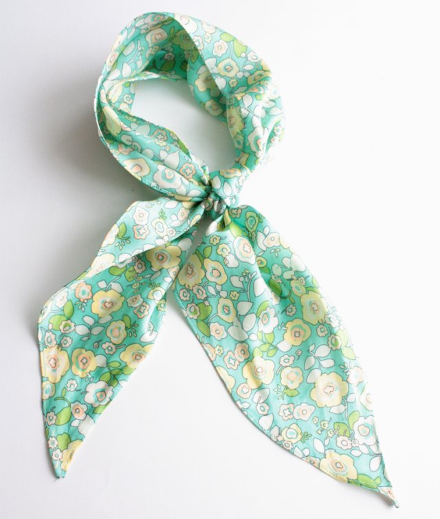 Subtelny szal w kwiatowe wzory na tle niebiesko-zielonym. Wykonany prawdopodobnie z jedwabiu.