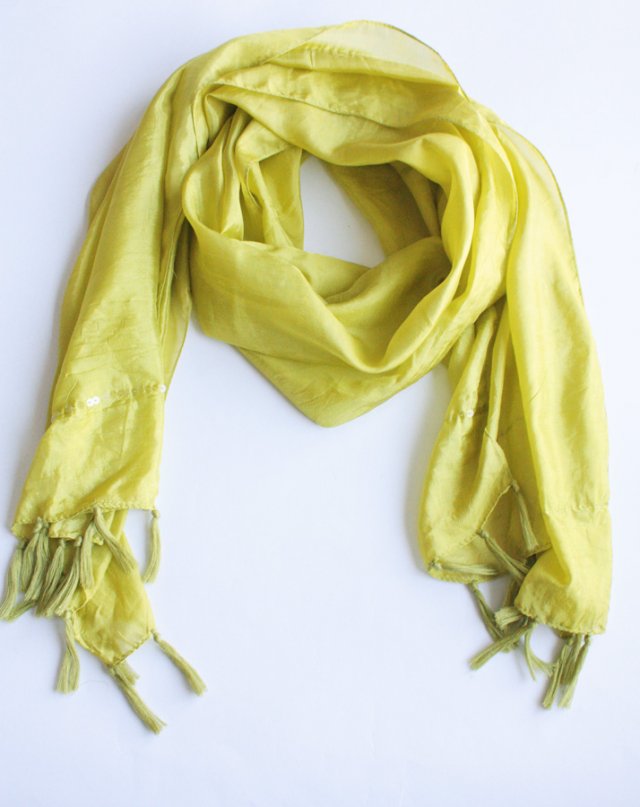 Limonkowy szal ozdobiony frędzlami i bardzo subtelnymi, przezroczystymi cekinami. Materiał oceniam na jedwab.